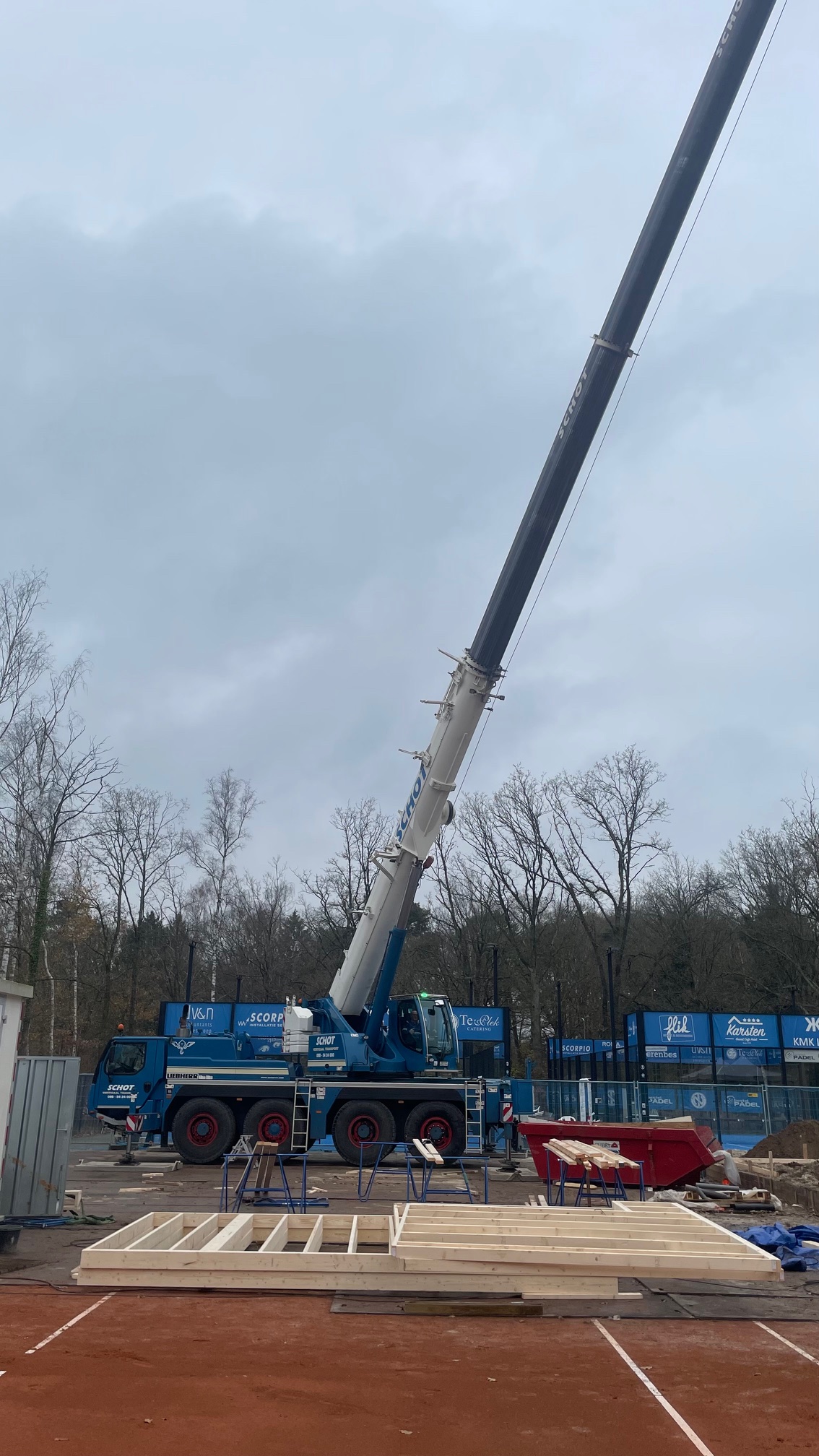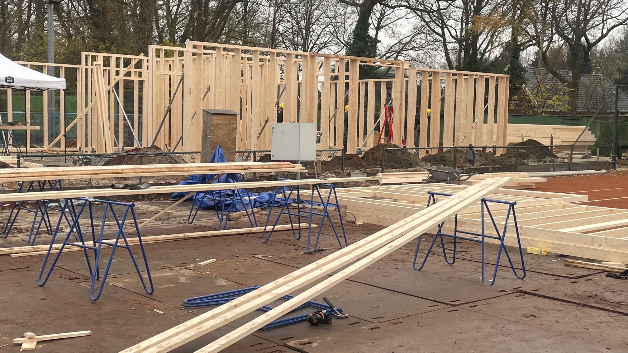 Met 5 man sterk wordt er hard gewerkt, om het gebouw te plaatsen, nu het weer nog best goed meewerkt. Streven is om in December een dak erop te hebben liggen, zodat het hout ook goed beschermd is, tegen nattigheid, en (wie weet?) een witte kerst!