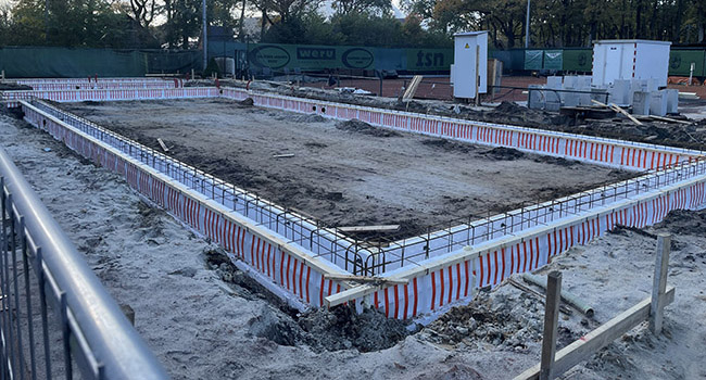 Na dat het graafwerk is afgerond, is het tijd voor de fundering. Er worden piepschuimen blokken neergelegd, voorzien van ijzeren bewapening. Een vrij specialistisch werkje, waar een beton-bedrijf de opdracht heeft gekregen. En zo worden de eerste contouren van het gebouw ook zichtbaar. En niet alleen van het hoofdgebouw, ook het bijgebouw aan de achterzijde begint nu zichtbaar te worden.